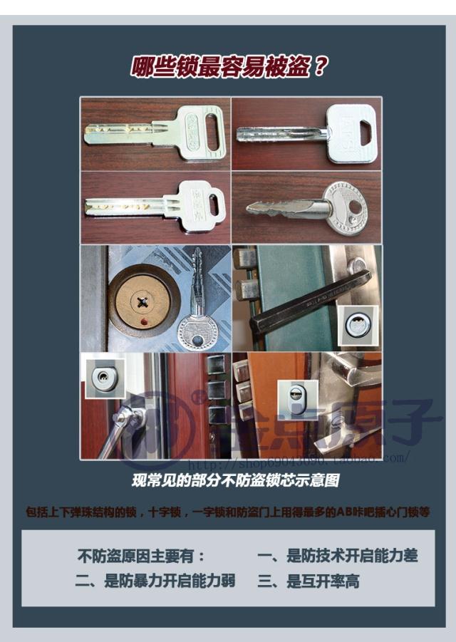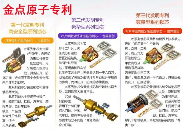 第三代金点原子超B级防盗锁芯专利获得世界首创,第三代发明专利尊贵型系列锁芯,采用叶片单面内铣牙钥匙设计,是目前世界上技术最先进的“前后离合”空转结构,双排十二叶片,内压式方形边柱锁定,有效防止了技术及暴力开启,采用奔驰车生产工艺,密匙量高达一千六百万,具备超强的防开、防撬功能。目前,金点原子锁昆明技术服务中心携手昆明警方在各小区开展防盗知识的宣传,同时免费上门换锁服务,力争做到“安全防盗,人人有责”。金点原子锁昆明技术服务中心热线:0871-63333366 服务网址: http://www.k3333366.com/ 下面的图文解说: