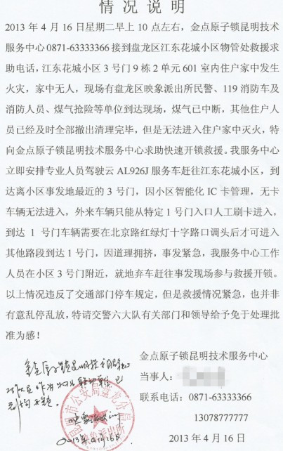 2013年4月16日早上10点左右,金点原子锁昆明技术服务中心0871-63333366接到昆明江东花城物管处救援求助电话,住户家中发生火灾,家中无人,现场有昆明市盘龙分局映象派出所民警、119消防车及消防人员、煤气抢险等单位到达现场救火,其他住户人员已经全部疏散完毕,但是无法进入住户家中救火,特向金点原子锁昆明技术服务中心救助开锁救援。金点原子锁昆明技术服务中心及时安排了车辆及人员及时到达现场打开了防盗门锁,在各单位的配合下把火扑灭了。但是因为事发紧急,违反了昆明市新交通法规,车辆没按规定停放,将要受到罚款及扣分处理,以下是管辖区派出所出具了事情发生经过的签章证明,恳请交警部门根据事情的实际情况给予免于处罚的申请。