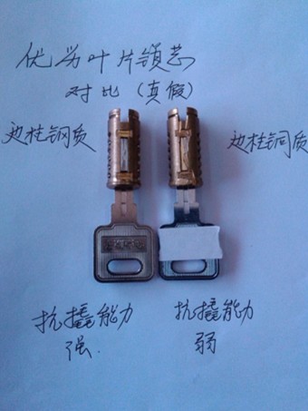 图中是昆明某小区住户在回家时,看到小区大门口在宣传低价的金点原子锁250元,更换两个月后回家就无法打开,住户电话0871-63333366投诉后,我工作人员上门开锁发现伪劣金点原子锁,伪劣的锁芯、钥匙外观要仔细比较才能发现字样颜色都不同,包装也不一样。锁芯解剖技术鉴定后的对比如图上