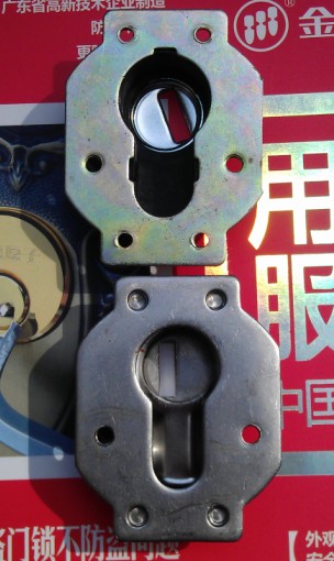 锁盖是保护防止电钻和暴力撬锁芯,图中上面的是假冒伪劣产品,下面的是原装正品。
